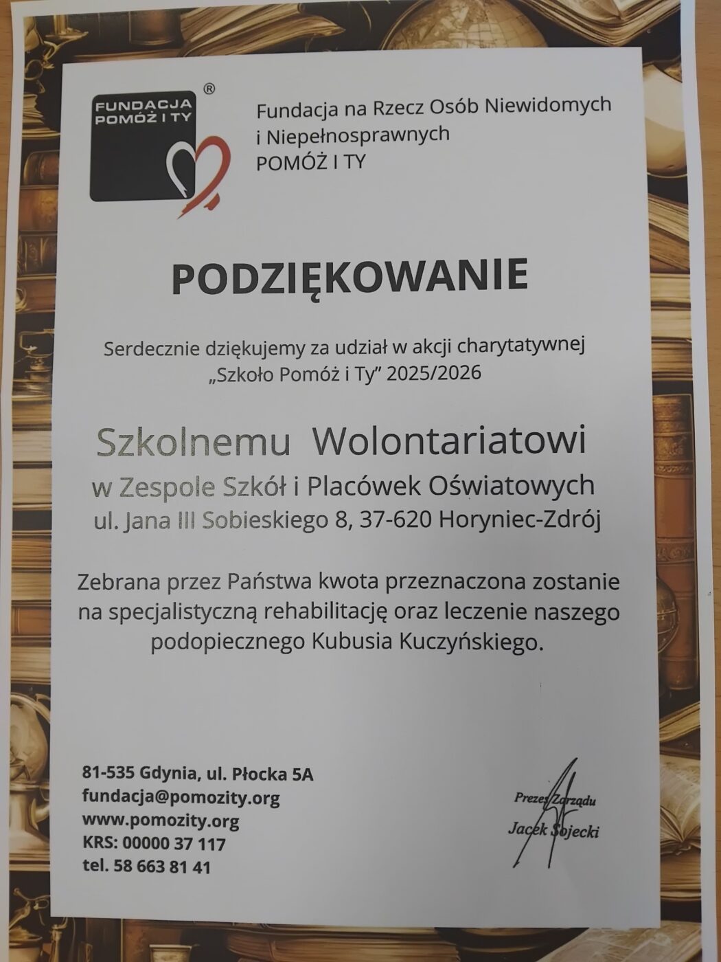 W trakcie działań w naszej szkole rozprowadzano pomoce edukacyjne oraz kalendarzyki w formie cegiełek, a cały dochód został przeznaczony na wsparcie Kubusia. Zebrane środki zostały już przekazane Fundacji na Rzecz Osób Niewidomych i Niepełnosprawnych „Pomóż