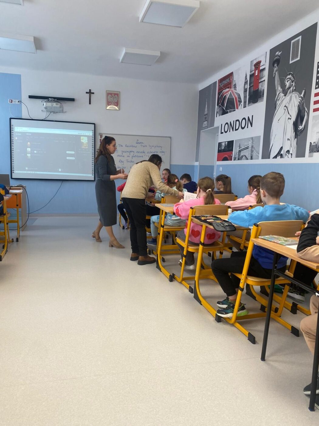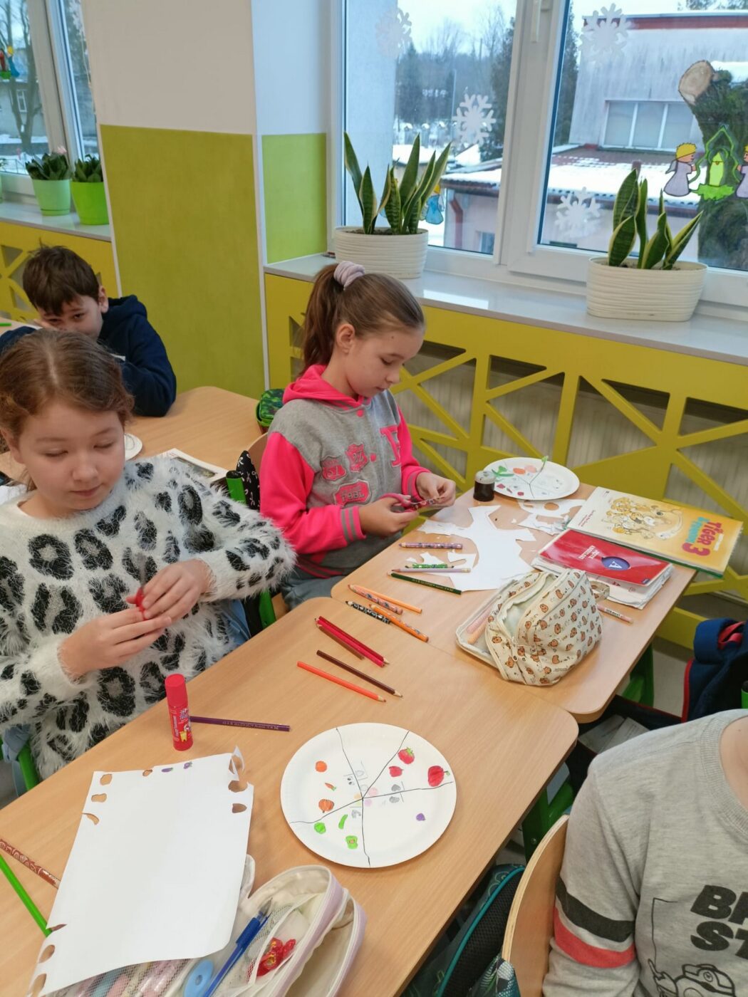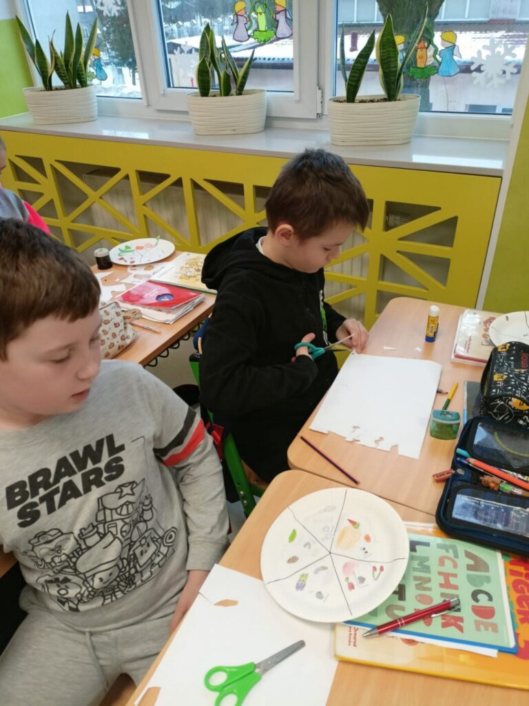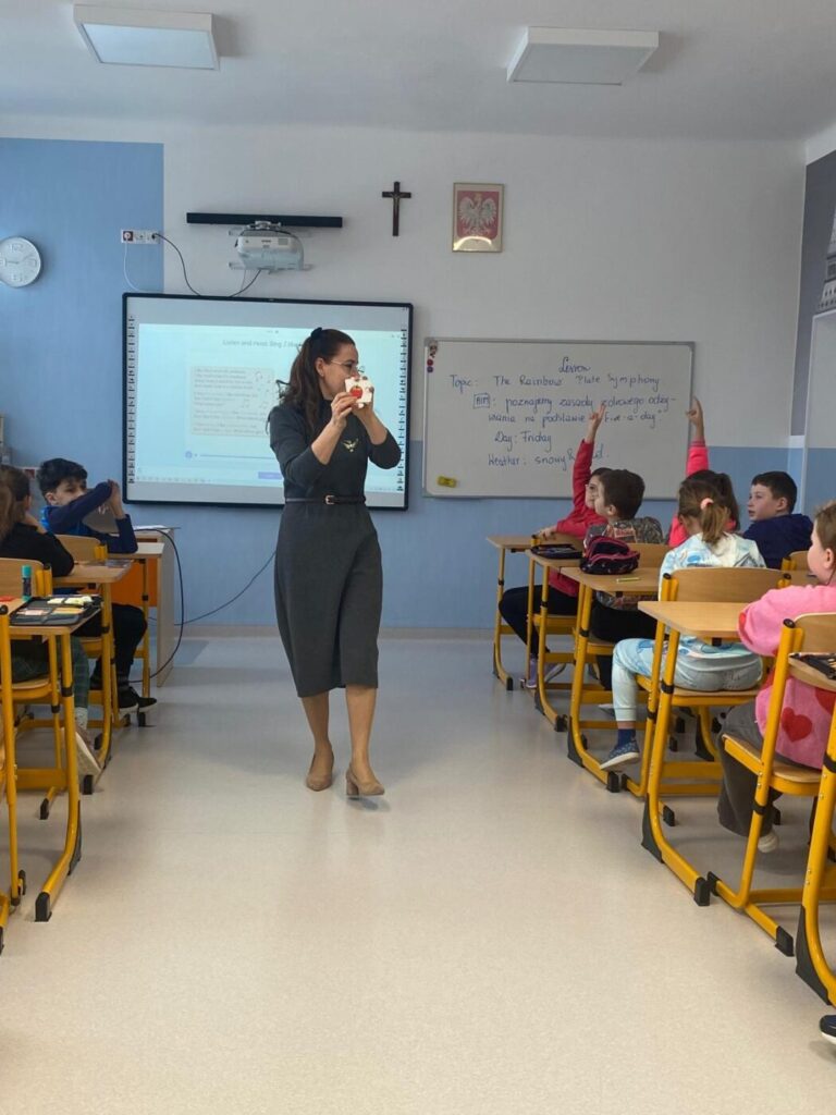 Lekcja otwarta odbyła się na zajęciach języka angielskiego w klasie IIIa. Obie nauczycielki współpracowały ze sobą zarówno w kontrolowaniu przebiegu zajęć, jak i przygotowaniu pomocy, co zwiększało efektywność lekcji. Z przyjemnością obserwowałyśmy, jak Izabela wspierała uczniów potrzebujących pomocy, nie tylko z orzeczeniem. Monitorowała ich pracę dyskretnie, bez zakłócania toku lekcji. Była czujna i uważna, jednocześnie nie narzucała się swoją obecnością, co sprzyjało samodzielności uczniów. W tym czasie Ewa – nauczyciel prowadzący mogła skupić się na przekazywaniu wiedzy, wykorzystując maksymalnie cenny czas dzieci. Lekcja nie pozostawiała czasu na nudę, wypełniona była różnymi aktywnościami, w które uczniowie chętnie się angażowali.