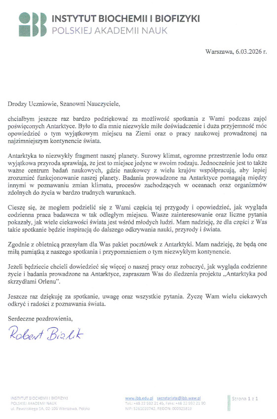 To była wyjątkowa lekcja. W piątek, 13 lutego, uczniowie klas VII wzięli udział w unikalnym wydarzeniu – bezpośrednim połączeniu online z Polską Stacją Antarktyczną im. Henryka Arctowskiego. Wszystko za sprawą wyjątkowego spotkania online z  Robertem Bialikiem polskim specjalistą w zakresie hydrologii, hydrodynamiki środowiska, oceanografii fizycznej, biologii morza, dr hab. nauk o Ziemi, adiunkt Instytutu Geofizyki i Instytutu Biochemii i Biofizyki Polskiej Akademii Nauk.
